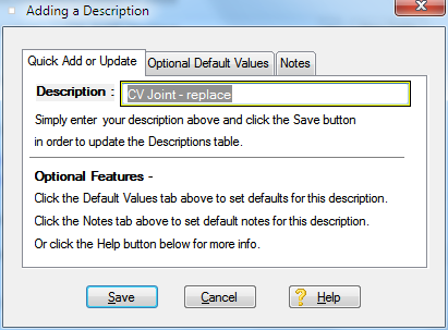 You can add a new description just by typing it. When you TAB out of the field, you will then be prompted to add the new description. (The program stores descriptions in the Descriptions and Defaults Table.)