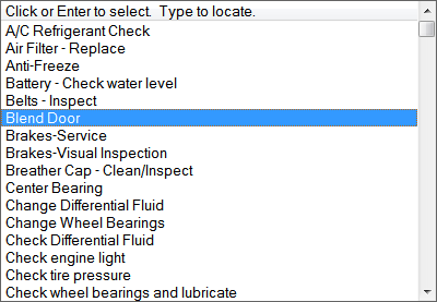 Description: (Required) Click the down arrow to see a list of descriptions (similar to the image below) or start typing a description and the closest match will appear. Once you click on one of the items from the drop-down list, any defaults for that item are also transferred from the Descriptions and Defaults table into the entry form fields. (If you did not select the item via a mouse click, then the updated fields will display when you click or tab out of the field.)