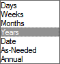 Time Between Service: Enter how many days, weeks, months or years between service for this item. Click the down arrow to see the list of time choices as in the example below: For days, weeks, months or year items, the due date is automatically calculated upon saving the form. Example: If you rotate the tires every 6 months, put in 6 months.