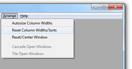 Reset Column Widths/Sorts - If you want to undo autosizing or any column sizing changes you have made, click on Reset Column Widths/Sorts. The column widths for the window with focus will be reset to their default widths and default sort order.