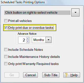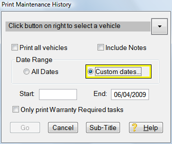 Print Maintenance History - Click on it and a setup window appears so you can print all vehicles or select one specific vehicle and indicate whether to print all service history or just warranty required history, whether to print all dates or a specific date range and whether to include notes you may have made on individual completed tasks.